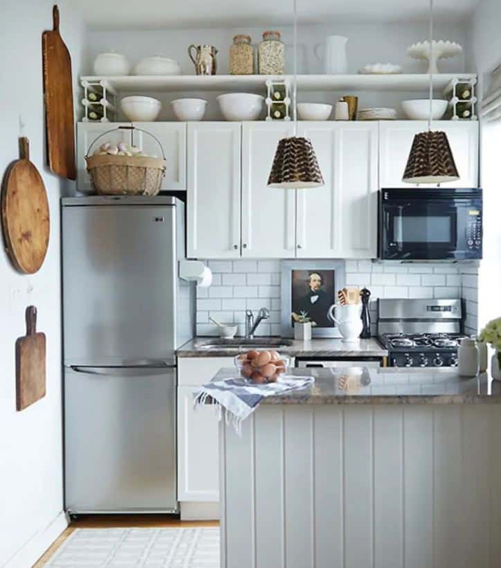 As storage is crucial in a small kitchen, an open shelving kitchen design may make it feel larger and less compact. Also, it does not cost much if you try to do it yourself. All you require is some wood, nails, shelf brackets, and wall anchors to create extra storage. Ensure there are nearly 15 to 20 inches of space from your countertop to the bottom of the lowest shelf.