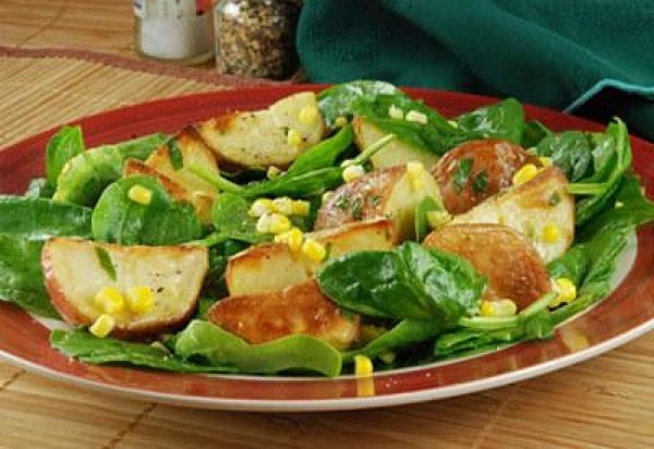 Boil cubed potatoes and corn in hot water and transfer to a bowl. Make a salad dressing with vinegar, salt, pepper, mustard, and olive oil. Toss the corn and potatoes in the dressing and then add in the chopped spinach along with the scallions.