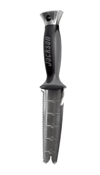 The Jackson 7-in-1 garden tool is an innovative design that offers multi-purpose benefits. The grip is made with a soft mold that allows an ergonomic grip to keep it from falling out of your hands. The transplanter and trowel can loosen the soil and dig, while the serrated edge on the tool really makes quick mulching. It can be used to cut through twine and sod since it also has a straight sharpened edge. You can keep it safe inside the leather sheath that it comes with.