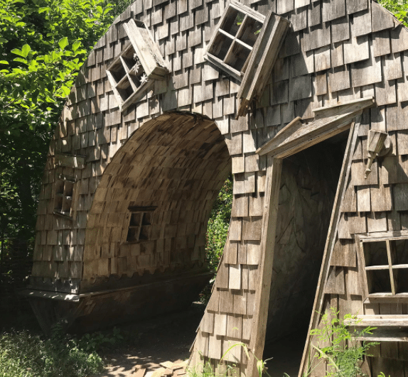 Well, what is a house that is not made out of wood and is twisty such that its roof seems to touch the ground! McNaughton, the architect of this life-sized fairytale house, taught woodworking for 35 years at the University of Southern Indiana and created this artwork as an interactive sculpture that engages the viewer’s imagination.