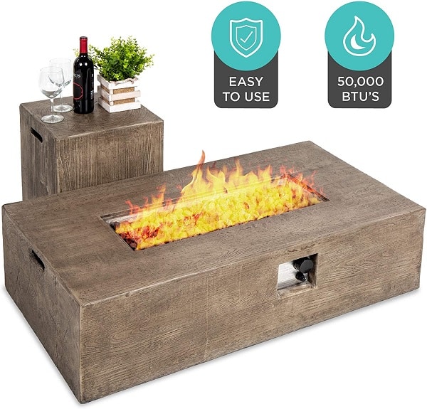 Best Choice Products 48″x 27″ with 50,000 BTU. This is a Patio propane fire pit table It comes with a side table that doubles as tank storage and has a wood finish and comes with a cover as well. It is a good addition to any outside sitting area.