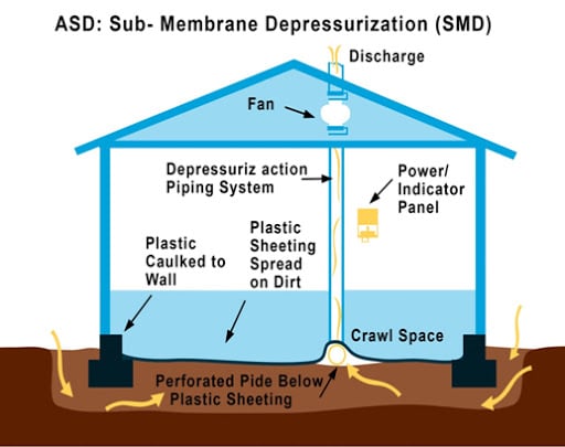 Some homes have crawl spaces that contain exposed dirt, and these crawl spaces can serve as a source of radon gas. One of the radon mitigation methods used in such spaces is the Sub-Membrane Depressurization. Special membranes made of plastic are used to encapsulate the dirt. Once encapsulated, the membrane is sealed around the support columns. Any plumbing slacks are accommodated under the dirt floor in the crawl space. Following this, a PVC collection pipe is sealed under the plastic membrane and is tied into the pipe connected to the fan and vent. Once the entire system is set up, the air is drawn from the sealed membrane and is removed through the vent. It also takes with it all the moisture from the soil of the dirt bed, and hence, this method serves a dual purpose – mitigating radon and dehumidifying the crawl spaces.